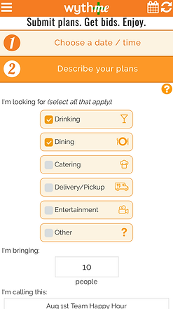 WythMe users submit custom plans with a date / time, number of people, an area they'd like to go, and other optional descriptors.