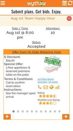 Enter the details of your plans, including date/time, location, and type such as drinks, dinner, or catering. Optionally, enter additional details such as rating, cuisine, or other parameters to match your request with participating WythMe locations. Submit and wait for the offers to roll in!